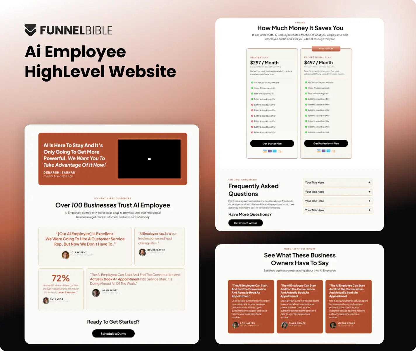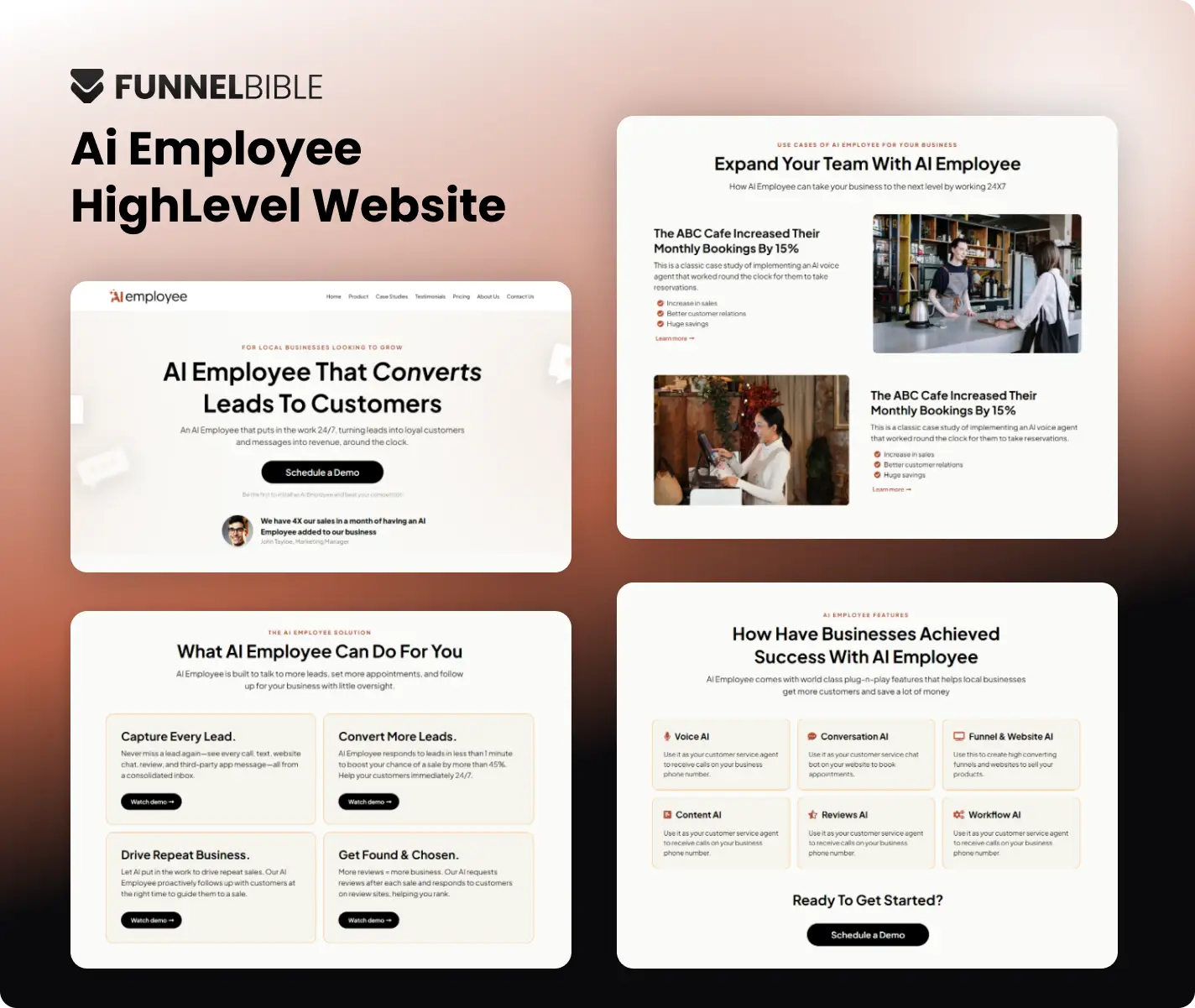 The A.I. Employee Website Template helps you launch your digital presence fast with a sleek, high-performing website built on HighLevel—designed specifically for AI automation and digital workforce solutions.